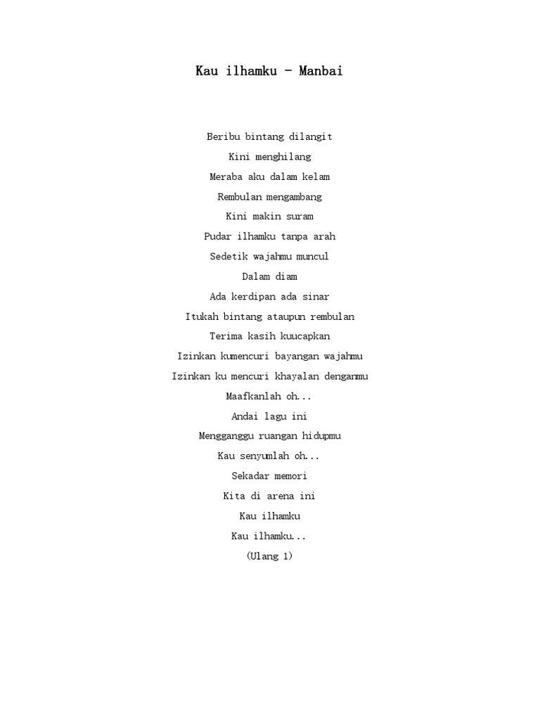 Versi baru lagu ini telah dirakamkan. MAN BAI -Kau Ilhamku Verse C G Am G Beribu bintang di langit kini menghilang F G Meraba aku dalam kelam C G Am G Rambulan mengambang kini makin suram F G C Pudar ilhamku tanpa arah C G Am G Sedetik wajahmu muncul dalam diam F G Ada kerdipan ada sinar C G Am G Itukah bintang ataupun rambulan F G C Terima kasih ku ucapkan Chorus C G Am G F. Pudar ilhamku tanpa arah.
